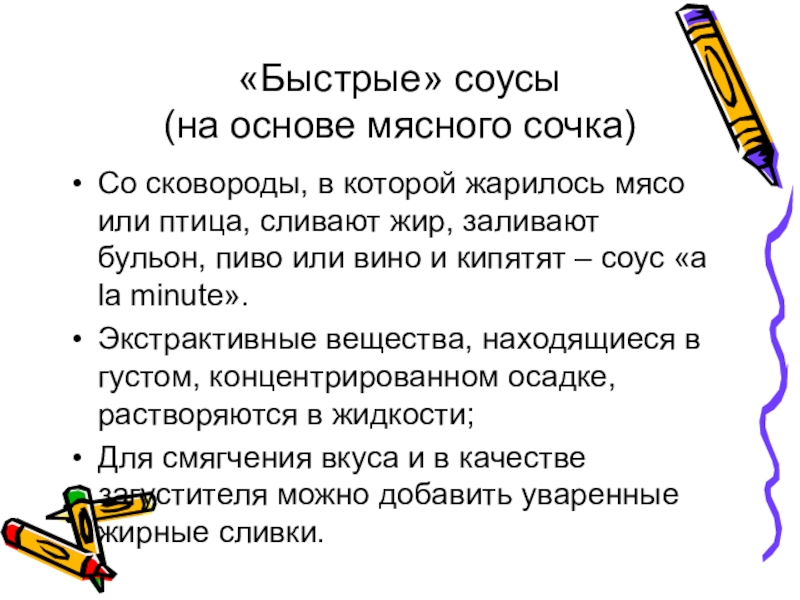или птица, сливают жир, заливают бульон, пиво или вино и кипятят – соус «a la minute».