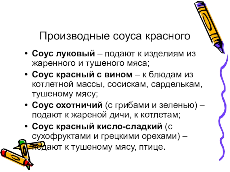Соус красный с вином – к блюдам из котлетной массы, сосискам, сарделькам, тушеному мясу;