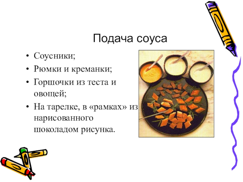 к блюдам, имеющим малопривлекательный вид подают непрозрачные соусы, маскирующие продукты;