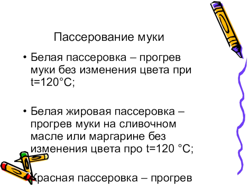жировая пассеровка – прогрев муки на сливочном масле или маргарине без изменения цвета про t=120 °С;