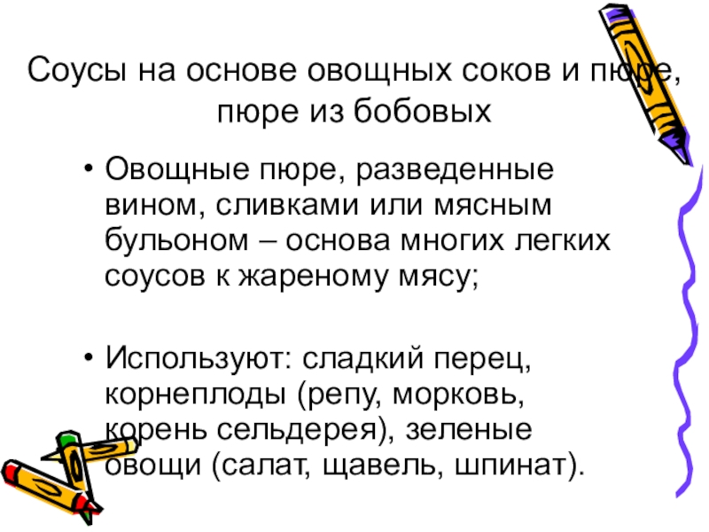 Слайд 30Соусы на основе овощных соков и пюре, пюре из бобовых