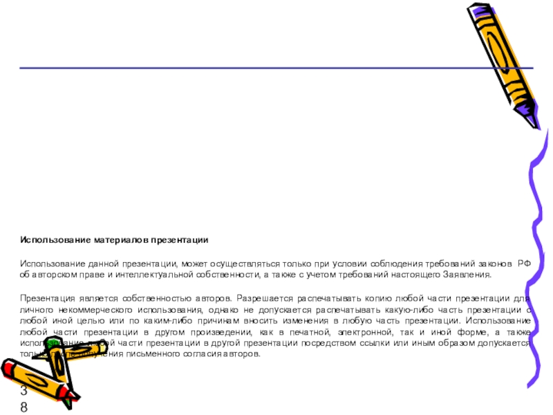 Презентация является собственностью авторов. Разрешается распечатывать копию любой части презентации для личного некоммерческого использования, однако не допускается распечатывать какую-либо часть презентации с любой иной целью или по каким-либо причинам вносить изменения в любую часть презентации. Использование любой части презентации в другом произведении, как в печатной, электронной, так и иной форме, а также использование любой части презентации в другой презентации посредством ссылки или иным образом допускается только после получения письменного согласия авторов.