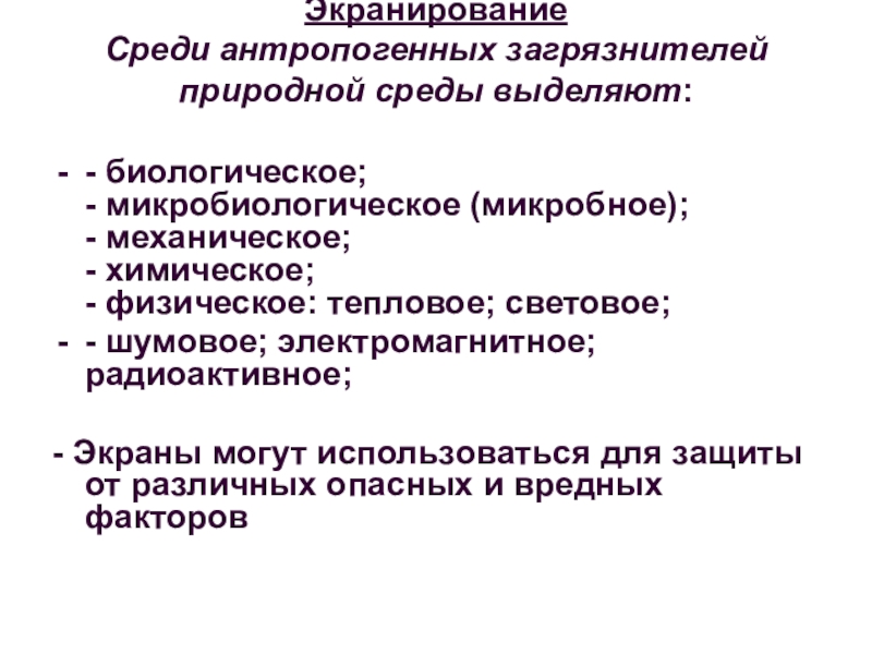 - Экраны могут использоваться для защиты от различных опасных и вредных факторов