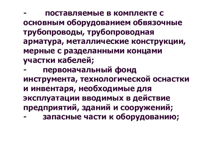 - первоначальный фонд инструмента, технологической оснастки и инвентаря, необходимые для эксплуатации вводимых в действие предприятий, зданий и сооружений;