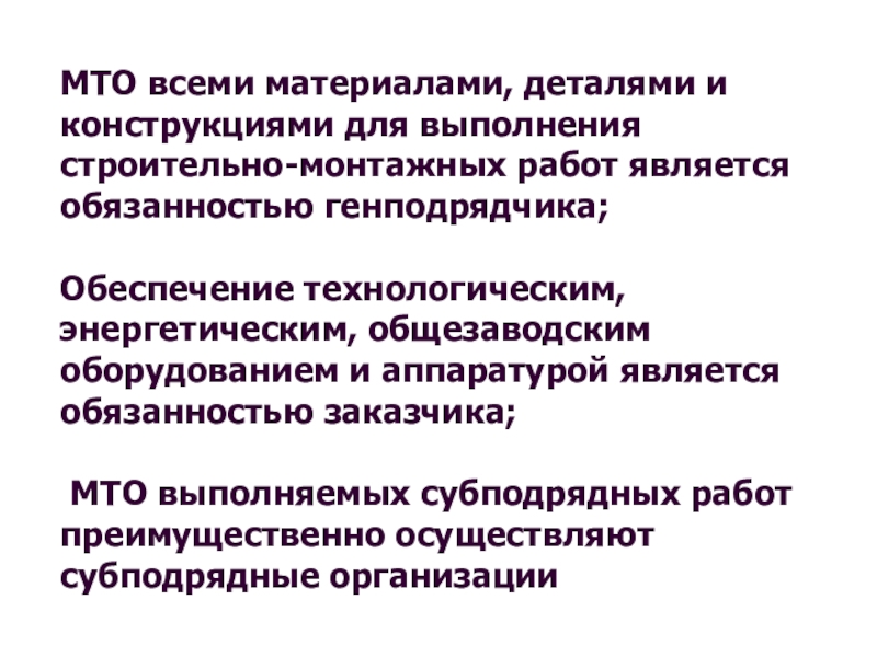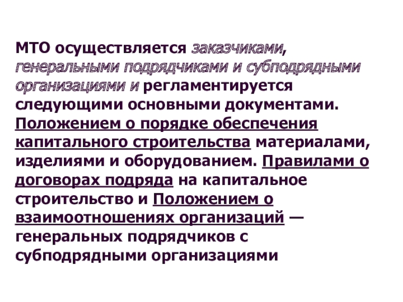 МТО осуществляется заказчиками, генеральными подрядчиками и субподрядными организациями и регламентируется следующими