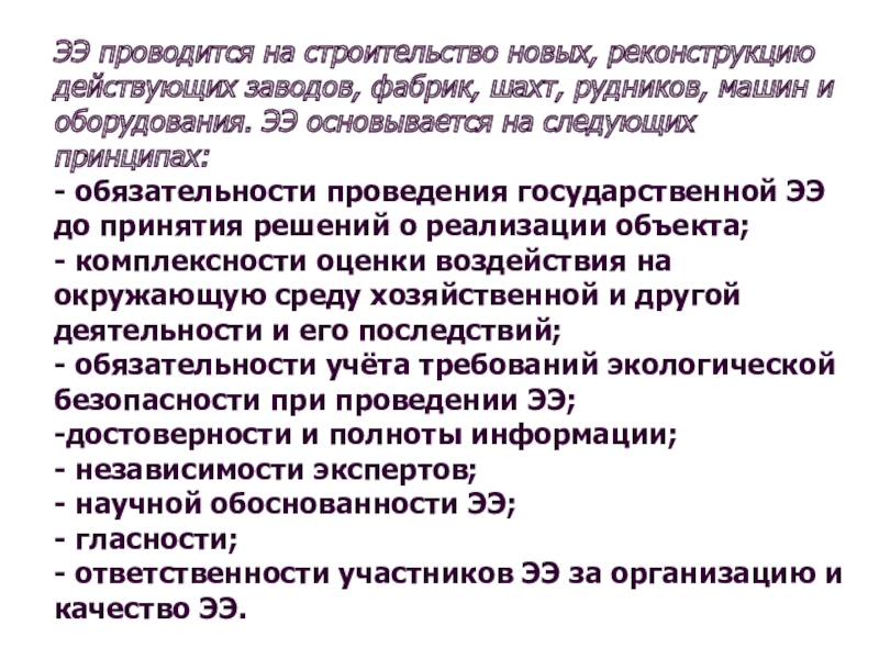 - обязательности учёта требований экологической безопасности при проведении ЭЭ;