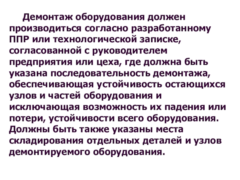 Слайд 26 Демонтаж оборудования должен производиться согласно разработанному ППР или