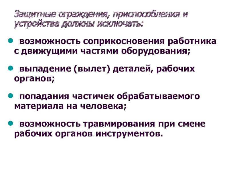 Слайд 35Защитные ограждения, приспособления и устройства должны исключать: