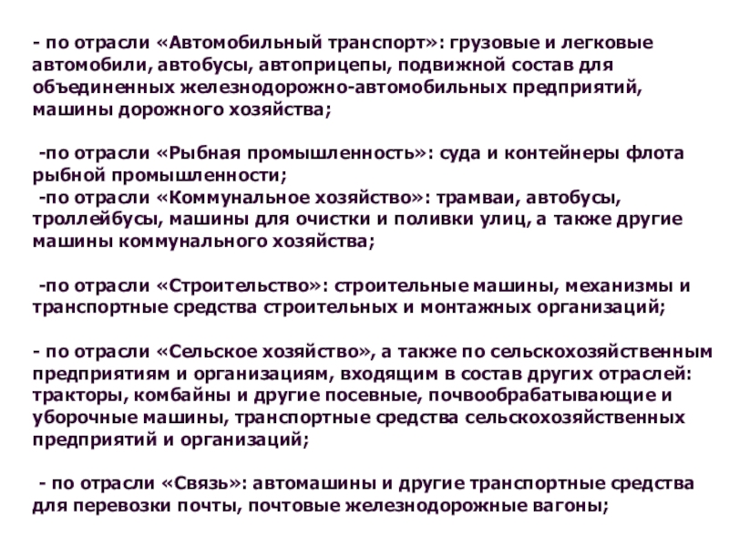 Слайд 18- по отрасли «Автомобильный транспорт»: грузовые и легковые автомобили, автобусы, автоприцепы,
