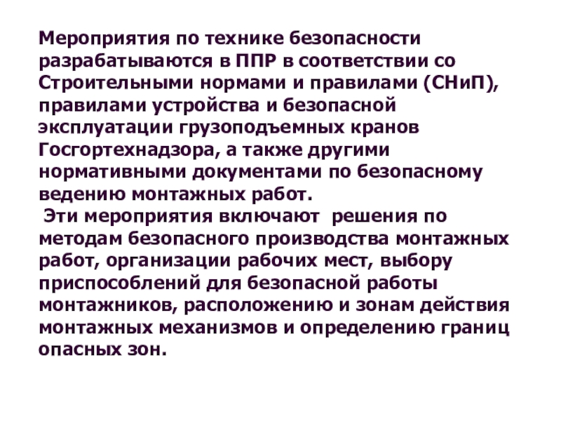 Слайд 24Мероприятия по технике безопасности разрабатываются в ППР в соответствии со Строительными