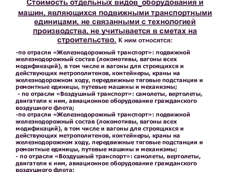 Стоимость отдельных видов оборудования и машин, являющихся подвижными транспортными единицами, не