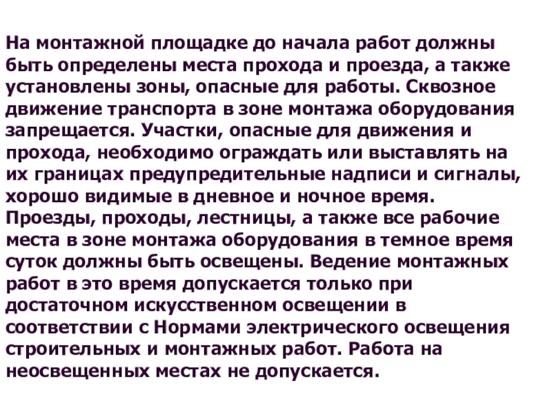 Проезды, проходы, лестницы, а также все рабочие места в зоне монтажа оборудования в темное время суток должны быть освещены. Ведение монтажных работ в это время допускается только при достаточном искусственном освещении в соответствии с Нормами электрического освещения строительных и монтажных работ. Работа на неосвещенных местах не допускается.