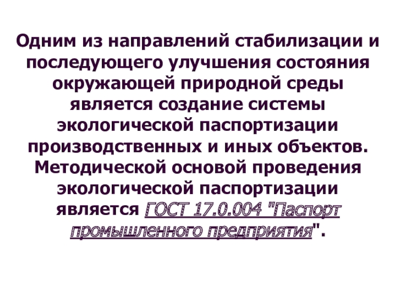 Методической основой проведения экологической паспортизации является ГОСТ 17.0.004 "Паспорт промышленного предприятия".