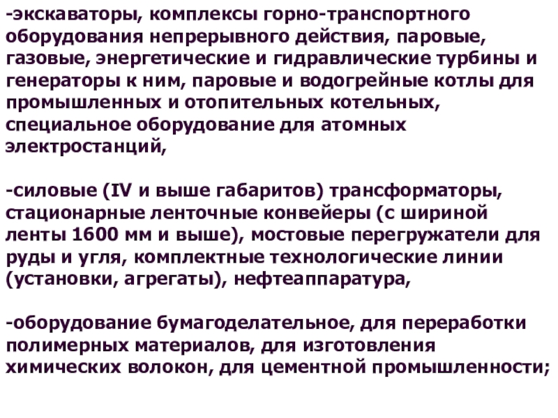 -силовые (IV и выше габаритов) трансформаторы, стационарные ленточные конвейеры (с шириной ленты 1600 мм и выше), мостовые перегружатели для руды и угля, комплектные технологические линии (установки, агрегаты), нефтеаппаратура,