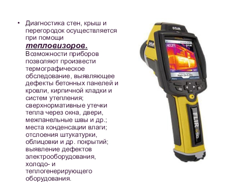Слайд 46Диагностика стен, крыш и перегородок осуществляется при помощи тепловизоров. Возможности приборов