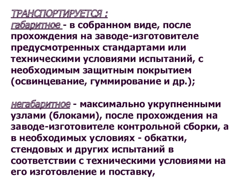негабаритное - максимально укрупненными узлами (блоками), после прохождения на заводе-изготовителе контрольной сборки, а в необходимых условиях - обкатки, стендовых и других испытаний в соответствии с техническими условиями на его изготовление и поставку,