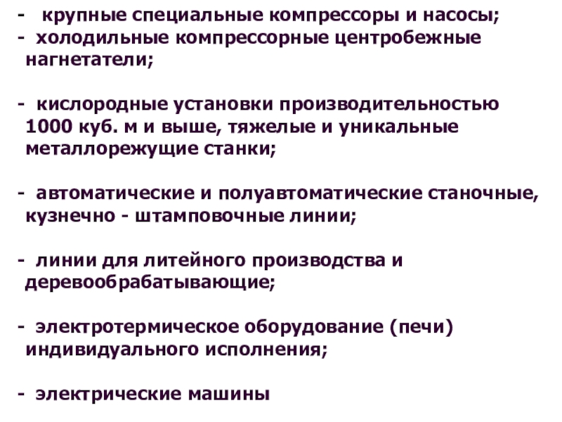 кислородные установки производительностью 1000 куб. м и выше, тяжелые и уникальные металлорежущие станки;