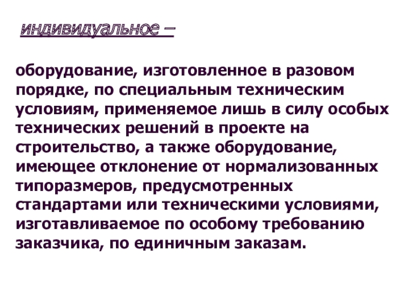 условиям, применяемое лишь в силу особых технических решений в проекте на строительство, а также оборудование, имеющее отклонение от нормализованных типоразмеров, предусмотренных стандартами или техническими условиями, изготавливаемое по особому требованию заказчика, по единичным заказам.