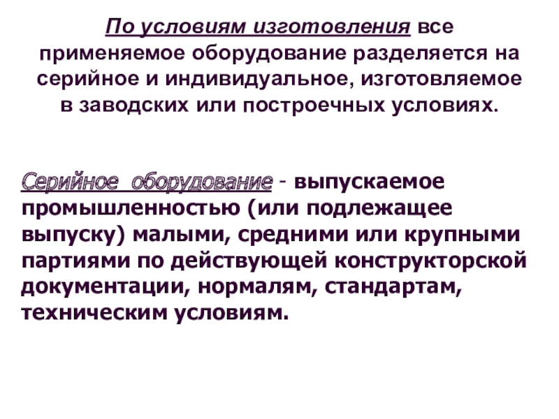 По условиям изготовления все применяемое оборудование разделяется на серийное и индивидуальное,