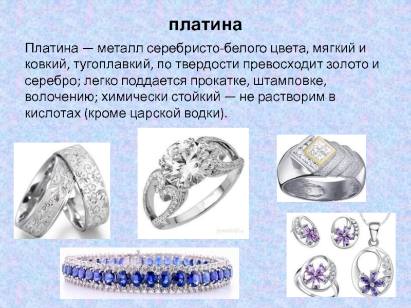 Платина — металл серебристо-белого цвета, мягкий и ковкий, тугоплавкий, по твердости