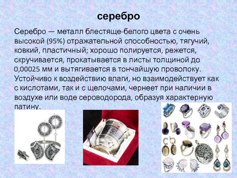 Серебро — металл блестяще-белого цвета с очень высокой (95%) отражательной способностью,