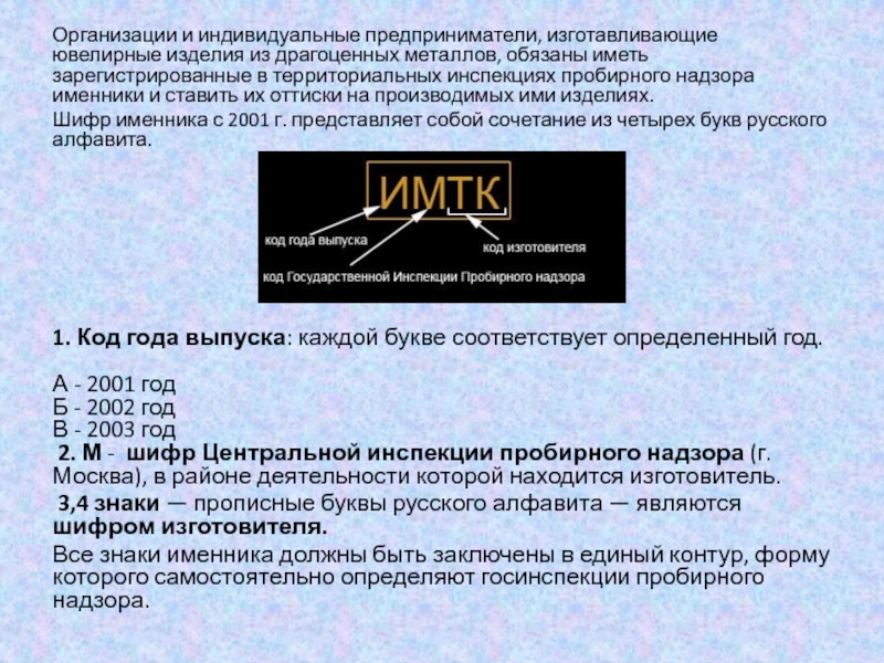 иметь зарегистрированные в территориальных инспекциях пробирного надзора именники и ставить их оттиски на производимых ими изделиях.