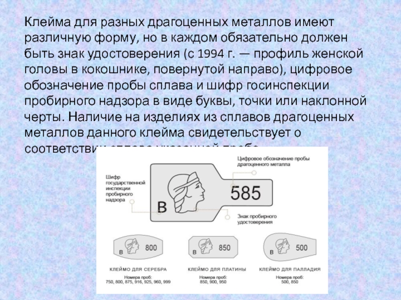 Слайд 35Клейма для разных драгоценных металлов имеют различную форму, но в каждом