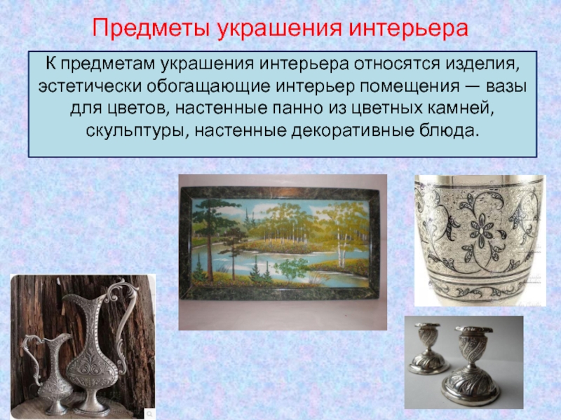 К предметам украшения интерьера относятся изделия, эстетически обогащающие интерьер