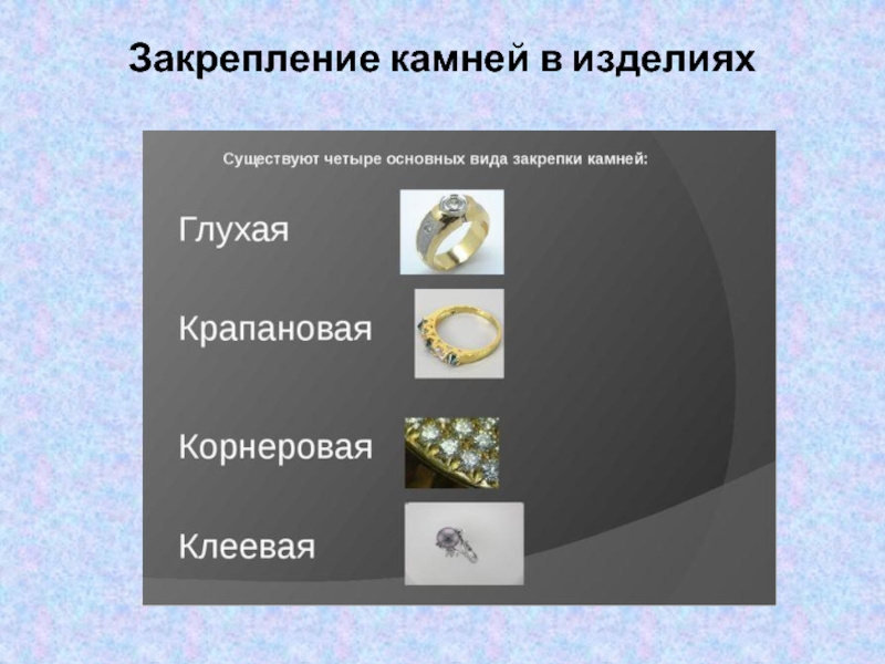 с защелкиванием, не иметь острых кромок, камни должны быть парными по размеру, цвету и огранке.