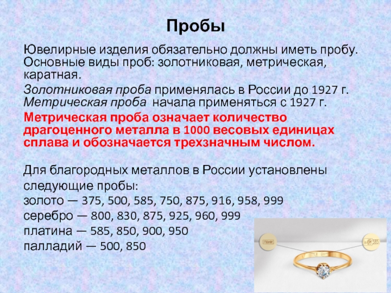 Ювелирные изделия обязательно должны иметь пробу. Основные виды проб: золотниковая, метрическая,