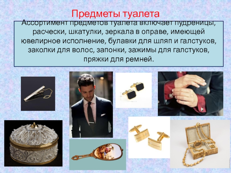 Ассортимент предметов туалета включает пудреницы, расчески, шкатулки, зеркала в оправе, имеющей ювелирное
