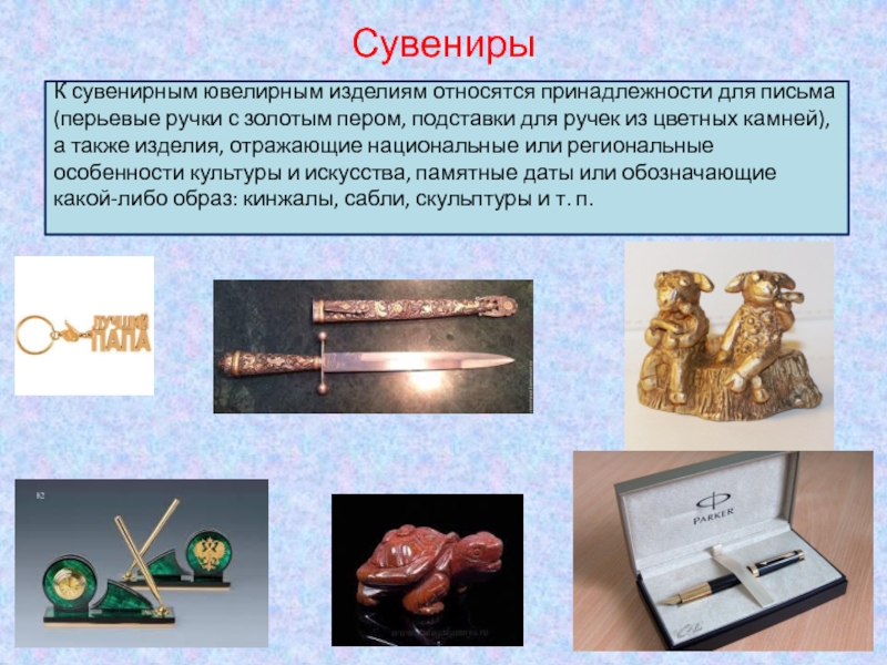 золотым пером, подставки для ручек из цветных камней), а также изделия, отражающие национальные или региональные особенности культуры и искусства, памятные даты или обозначающие какой-либо образ: кинжалы, сабли, скульптуры и т. п.