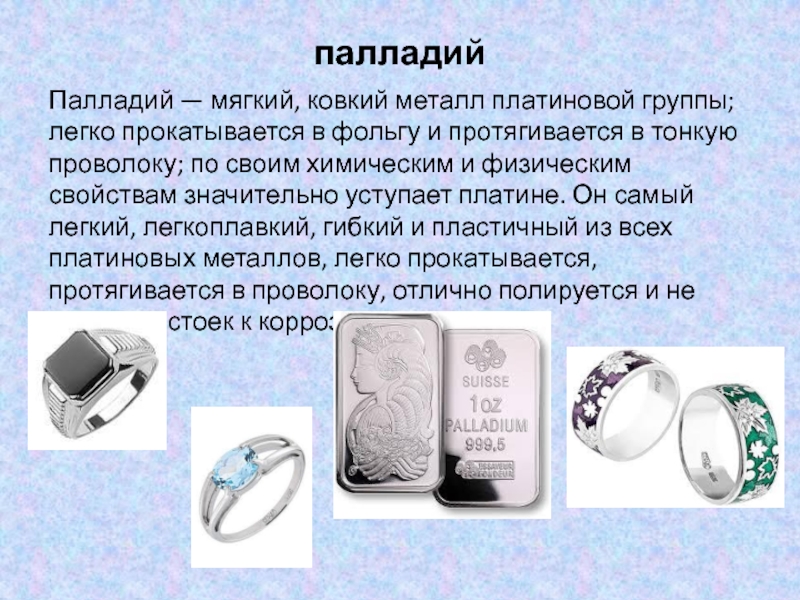 Палладий — мягкий, ковкий металл платиновой группы; легко прокатывается в фольгу