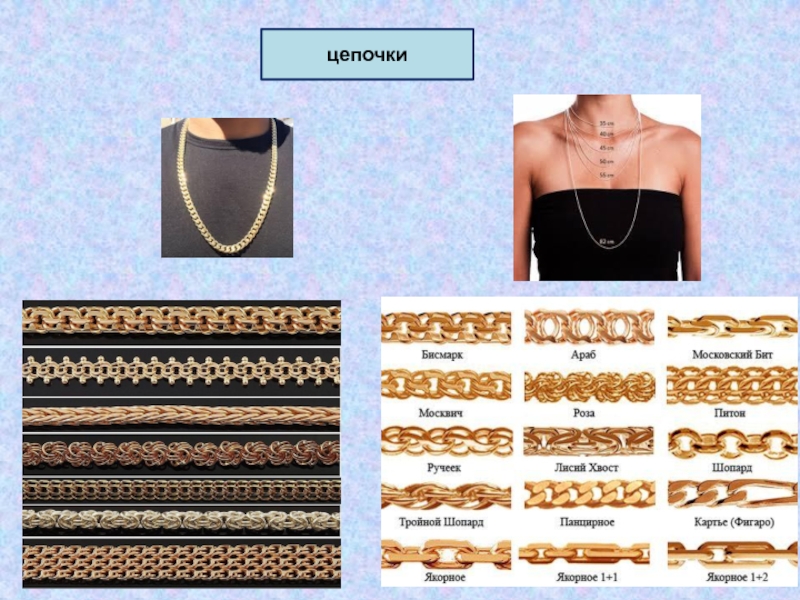 У цепочек все детали должны быть прочно соединены между собой, звенья цепочки – подвижные, цепочка должна обладать максимальной гибкостью, текучестью и при отвесе иметь строго вертикальное направление, без угловатостей. Замок цепочки при нажиме должен свободно открываться и закрываться, запор хорошо пружинить.