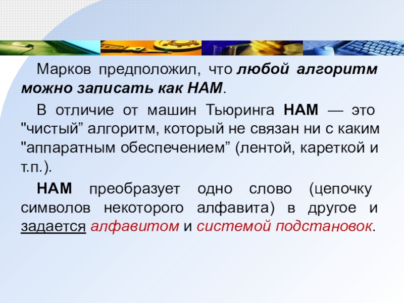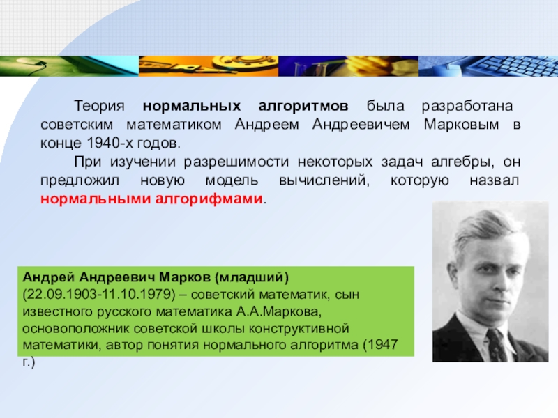 Андрей Андреевич Марков (младший) (22.09.1903-11.10.1979) – советский математик, сын известного русского математика А.А.Маркова, основоположник советской школы конструктивной математики, автор понятия нормального алгоритма (1947 г.)