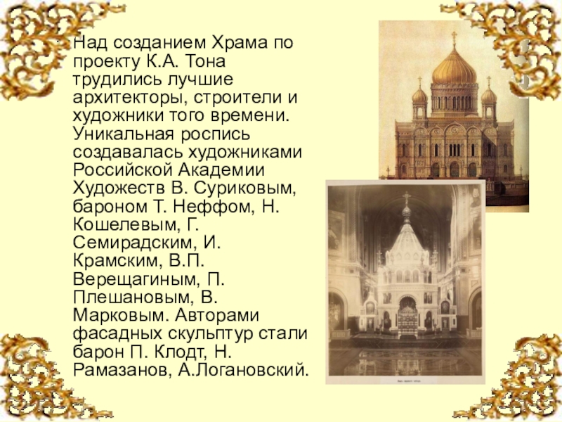 Над созданием Храма по проекту К.А. Тона трудились лучшие архитекторы, строители и художники того времени. Уникальная роспись