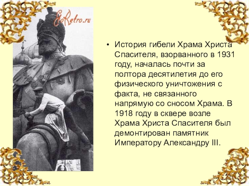 за полтора десятилетия до его физического уничтожения с факта, не связанного напрямую со сносом Храма. В 1918 году в сквере возле Храма Христа Спасителя был демонтирован памятник Императору Александру III.