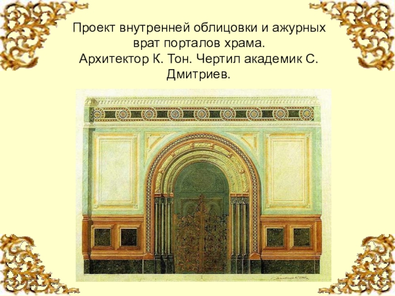 Слайд 6Проект внутренней облицовки и ажурных врат порталов храма. Архитектор К. Тон.