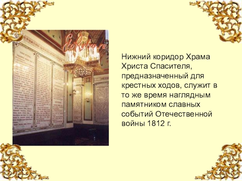 Нижний коридор Храма Христа Спасителя, предназначенный для крестных ходов, служит в то же время наглядным памятником славных