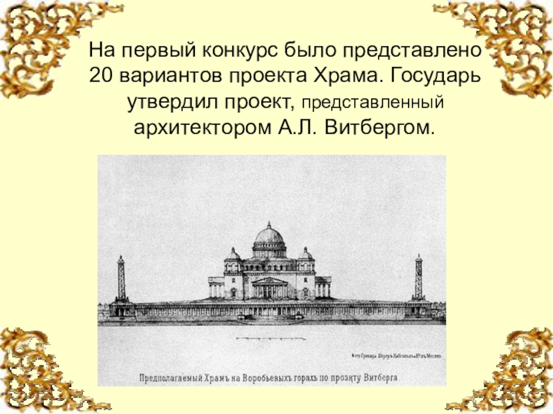 Слайд 3На первый конкурс было представлено 20 вариантов проекта Храма. Государь утвердил