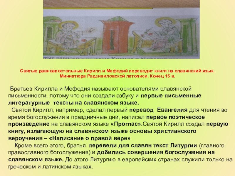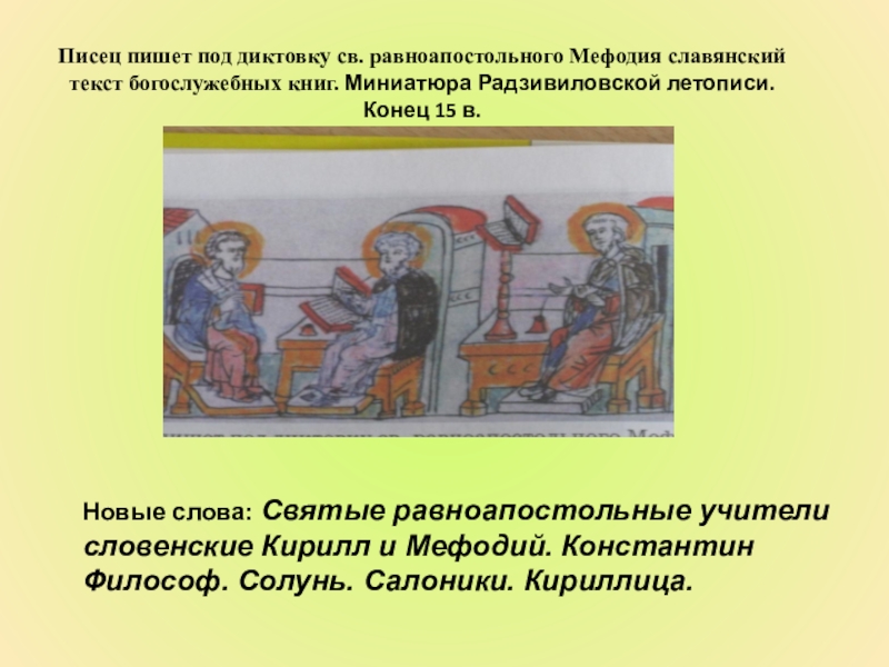 Писец пишет под диктовку св. равноапостольного Мефодия славянский текст богослужебных книг. Миниатюра Радзивиловской летописи. Конец 15 в.