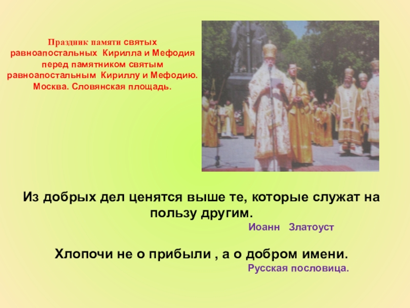Праздник памяти святых равноапостальных Кирилла и Мефодия перед памятником святым равноапостальным Кириллу и Мефодию. Москва. Словянская площадь.