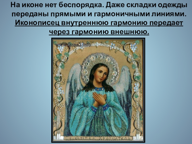 Слайд 14На иконе нет беспорядка. Даже складки одежды переданы прямыми и гармоничными