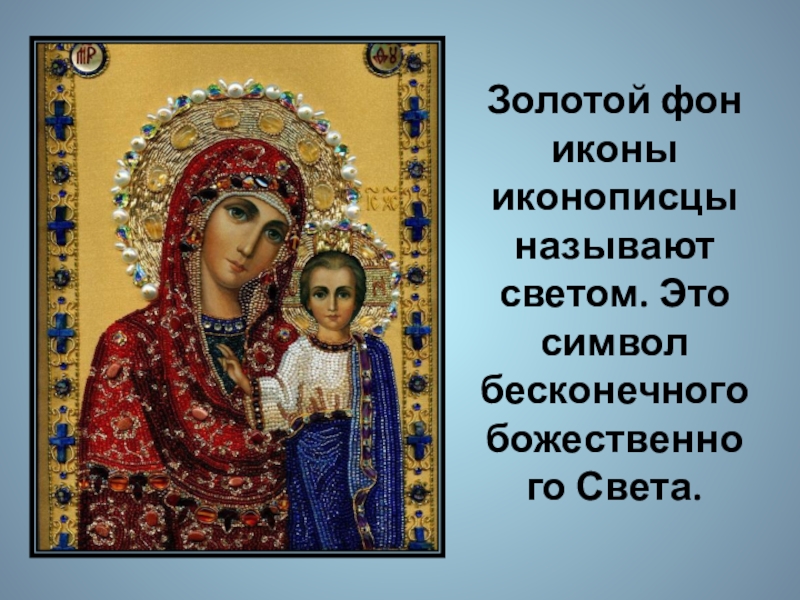 Слайд 11Золотой фон иконы иконописцы называют светом. Это символ бесконечного божественного Света.