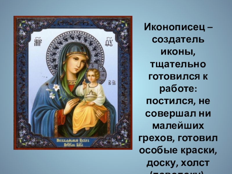 Слайд 3Иконописец – создатель иконы, тщательно готовился к работе: постился, не совершал