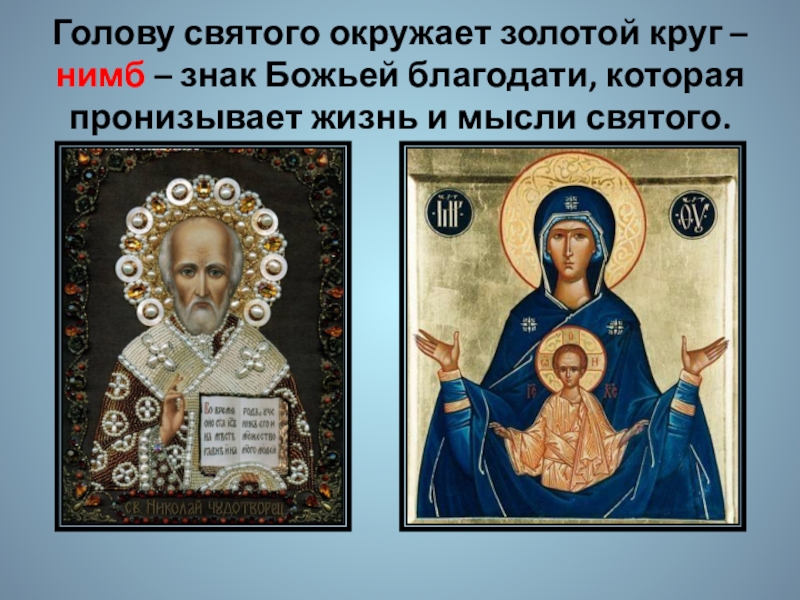 Слайд 12Голову святого окружает золотой круг – нимб – знак Божьей благодати,
