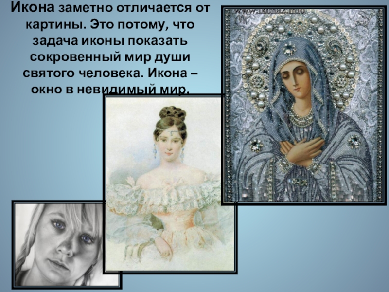 Слайд 6Икона заметно отличается от картины. Это потому, что задача иконы показать