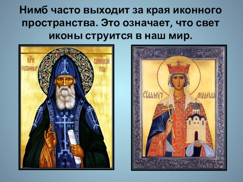 Слайд 13Нимб часто выходит за края иконного пространства. Это означает, что свет