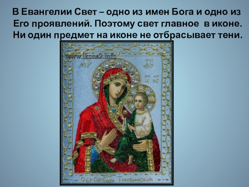 Его проявлений. Поэтому свет главное в иконе. Ни один предмет на иконе не отбрасывает тени.