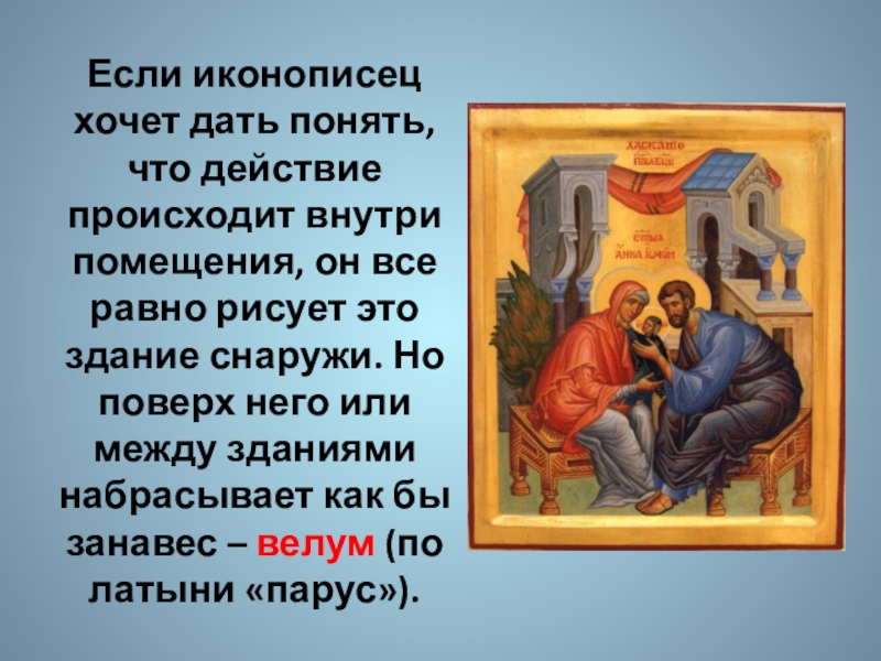 Слайд 10Если иконописец хочет дать понять, что действие происходит внутри помещения, он
